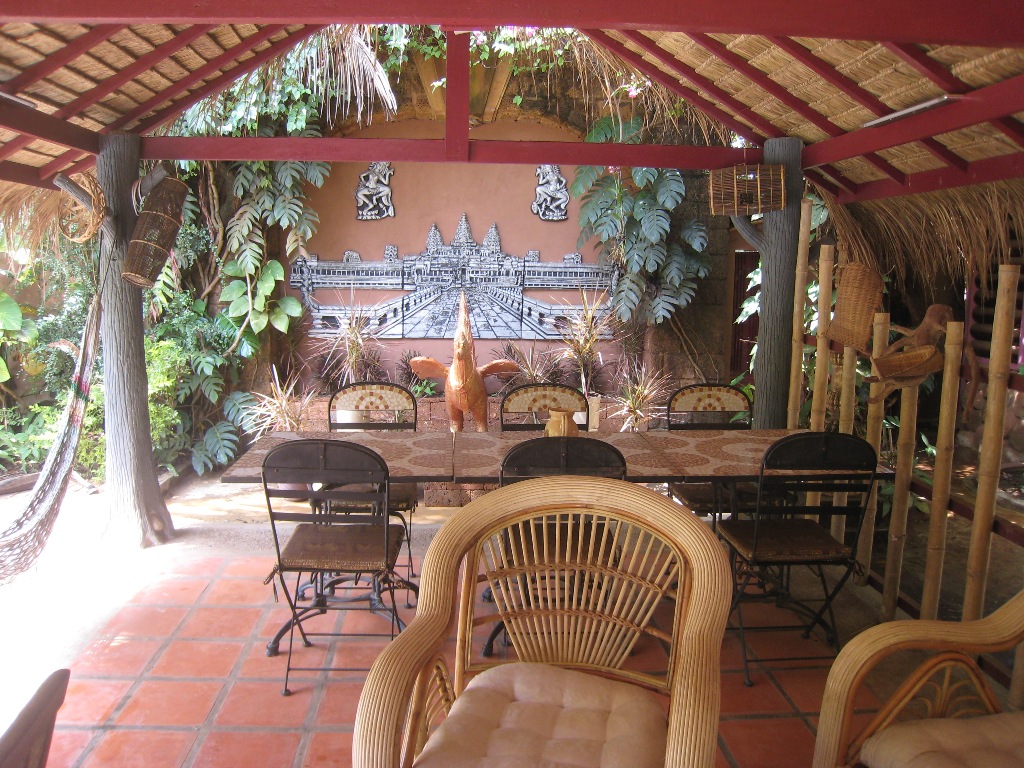Les petits déjeuners sont servis à la table commune en bordure de piscine. Toutefois, pour les amoureux, il peut être servi en chambre. Vous avez la possibilité de déjeuner ou diner sur place, nous disposons d'un cuisinier qui saura vous faire connaître et apprécier les différentes spécialités locales. Deux possibilités vous sont offertes pour les repas : ils peuvent être pris de façon conviviale avec notre famille et nous partageons tous les plats prévus au menu ce jour-là (5 $/personne avec une boisson au choix) ou seconde possibilité : à la carte. Nous proposons également des pizzas et produisons nous-mêmes le pain, croissants et pains au chocolat pour le petit déjeuner. Bière pression ANGKOR et café NESPRESSO ne sont pas oubliés…. Cours de cuisine gratuit !! Si le cœur vous en dit, pourquoi ne pas vous initier à la cuisine cambodgienne en confectionnant un de ses plats délicieux sous l’œil bienveillant de Visal ?