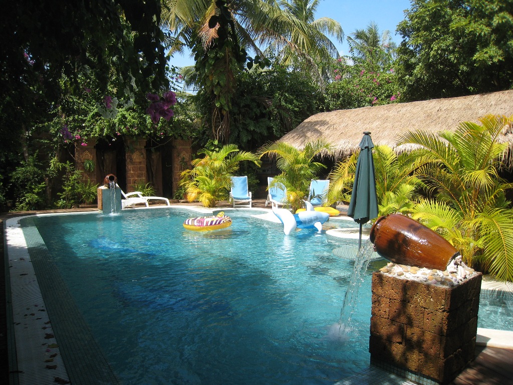 Avec son jardin tropical paysagé de plus de 3000 M² ou sont reconstitués en miniatures de nombreux temples de la région d’Angkor, elle offre un décor unique et un cadre de vie idéal pour votre séjour au Cambodge, comme vous aurez l'occasion de le constater en visitant cette page et en agrandissant les différentes images.