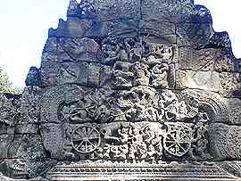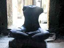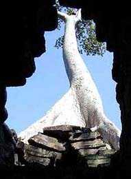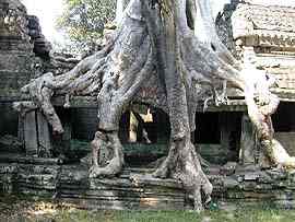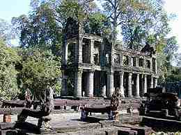 PREAH KHAN temple d'Angkor(L'épée sacrée du Roi) Le Preah Khan, temple d'Angkor au Cambodge, était en fait une véritable ville de plus de 50 ha. Malgré le vandalisme et pillage il reste encore quelques sculptures superbes. La ville abritait 10.000 personnes, 1000 danseuses et un grande école de Sanscrit. A l'origine ce fut un monastère bouddhiste dont les représentations de Bouddha furent détruites par les Brahmanes (prêtres hindous) et remplacées par des représentations hindouistes,(une seule représentation de Bouddha est restée). Pour arriver au centre du Preah Khan, une enfilade de galeries et de portes qui deviennent de plus en plus basses a mesure que l'on s'approche du centre (pour montrer son respect). Au centre , un grand Stuppa Bouddhiste en pierre qui fut rapporté au XVe siècle. Il y a des petits trous dans tous les murs au centre de l'édifice. A l'origine, dans chaque trou était enchâssé de l'or et des diamants, on dit que tout cela a été emporté et revendu par les Khmers Rouges. De superbes sculptures des dieux barattant la mer de lait, ainsi que de Vishnu et Lakshmi (sa femme), et l'emplacement de 3 Lingams (sexe des Dieux) , rond à la base pour Shiva, carré pour Brahma et octogonal pour Vishnu. On retrouve comme au Ta Phrom, une végétation luxuriante qui a repris ses droits.