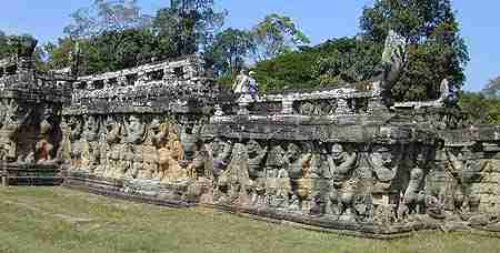 TERRASSE DES ÉLÉPHANTS Construite au début du XIIIe siècle cette terrasse en bordure du palais royal de Jayavarman VII, atteint 350 m de long. elle fut certainement construite pour assister aux spectacles donnés sur la grande place. Les éléphants sculptés sur une partie des murs (et récemment restaurés) ont donné leur nom au lieu. (à voir le matin de préférence)