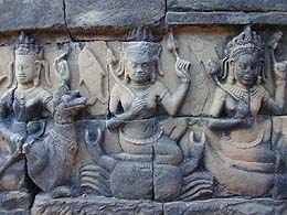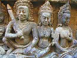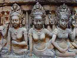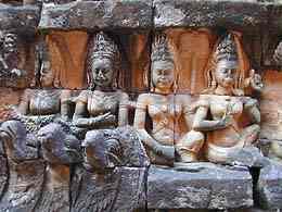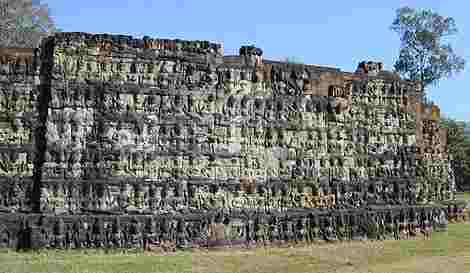 TERRASSE DU ROI LÉPREUX La terrasse du roi lépreux à Siem reap - Angkor au Cambodge est l'un des nombreux mystère d'Angkor. Cette terrasse du Roi Lépreux doit son nom à une petite statue asexuée que l'on pense être la statue du roi Yasovarman qui serait mort de la lèpre. Mais l'autre explication est que cette statue représenterait Yama, le dieu des morts, et la terrasse du Roi Lépreux aurait été en fait un crématorium royal. Sur le coté de la terrasse, une tranchée étroite et longue et une quantité de sculptures superbes et bien conservée, représentant des Apsaras, des génies et des monstres, quantité de divinités, d'une surprenante fraîcheur et beauté. Ce couloir très long, a été entièrement restauré, chaque sculpture démontée et replaquée sur les nouveaux murs. A voir absolument..