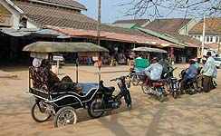 Vacance Cambodge - Voyage Cambodge Moyens de transport pour visiter Siem Reap Taxis, 4X4 et voitures climatisées peuvent vous accompagner partout, sur les différents sites archéologiques, dans la ville ou au Tonlé Sap. Il y a un autre moyen de transport très simple et agréable, les petites motos taxis avec chauffeur, qui vous conduisent ou vous voulez, toute la journée. Motos pour une personne, ou voiturette confortable pour 2 personnes (photo de gauche). Nous pouvons aussi vous organiser ce moyen de transport Les conducteurs roulent doucement et vous pouvez apprécier le paysage